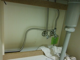 給湯室や洗面の空きスペースを利用して水道配管の分岐にて酸性電解水生成器へ水道水の取り込みを行い設置します。