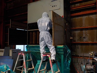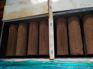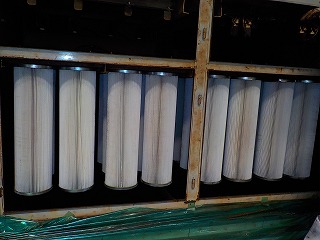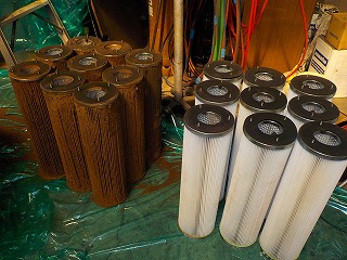 集塵機内部のバグフィルター、鉄粉でフィルターの折目が埋まり集塵の限界を感じます。目詰まりしたバグフィルターを全て取外し、内部清掃。使用済のバグフィルターは弊社の洗浄工場でリサイクル洗浄され、次回の保守作業に持参交換されます。