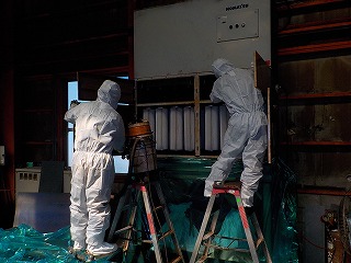 予め使用済のバグフィルターを引下げ、弊社洗浄工場にてリサイクル洗浄したバグフィルターを持参し装着し、試運転実施にて正常運転を確認できれば保守作業の完了です。