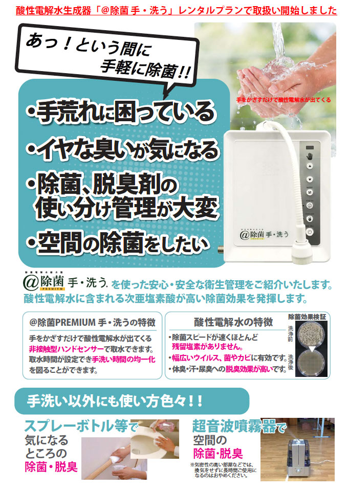 酸性電解水生成器「@除菌手・洗う」レンタルプランで取り扱い開始しました。