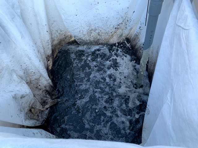 排水には鉱物油が含まれています。凝集剤などの薬剤で、浮上分離による排水処理装置です。