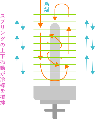 ・撹拌で冷媒を微細化、液化を促進することによる熱伝達率の向上