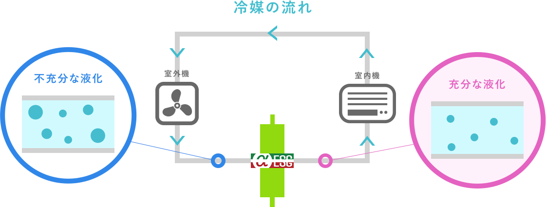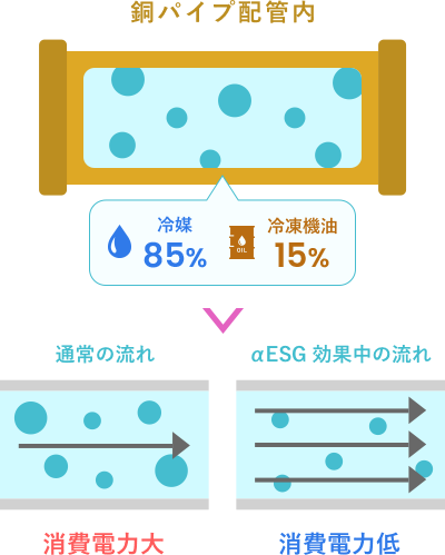 ・冷媒と冷凍機油を撹拌することにより、流動抵抗が減少し、圧縮曦=コンプレッサーの圧送ロスを大幅に低減