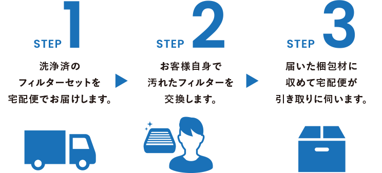 お客様自身で汚れたフィルターと差し替えて頂き、届いた梱包材に収めて頂ければ、宅配便が引き取りに伺います。