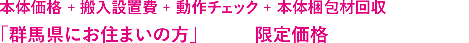 ※販売価格に搬入設置、動作チェック、本体梱包材回収を含んでおりますので、購入対象者(搬入設置住所)は群馬県在住の方に限らせていただきます。県外の方で購入希望される場合はご相談ください。