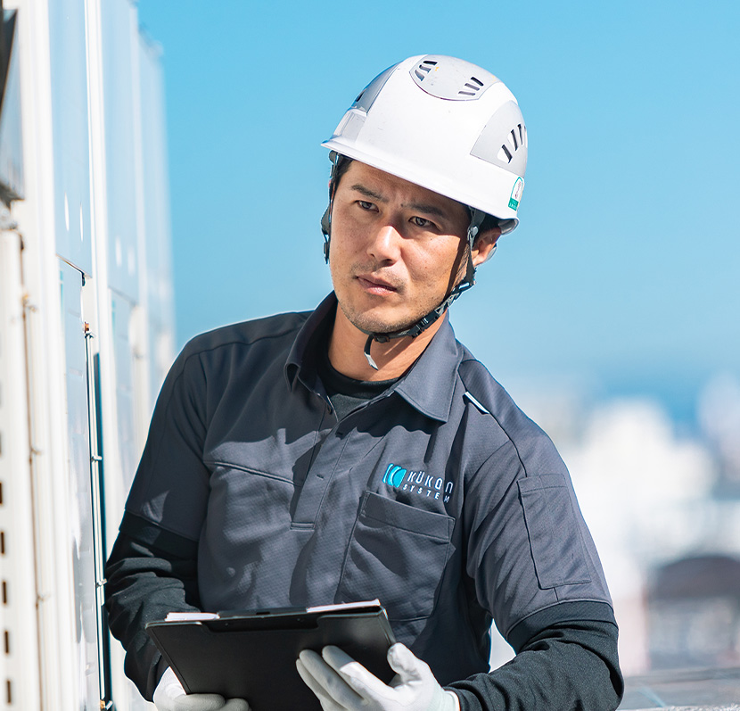 大型パチンコ店をはじめ、工場施設や企業の事務所などのエアコンの点検・修理、取り付け作業を中心に行っています。最近では、大規模な空調機器の入れ替えを行う現場の責任者として、業務の円滑な進行や作業スタッフの管理を行うなど、一日の大半の時間を現場で作業しています。