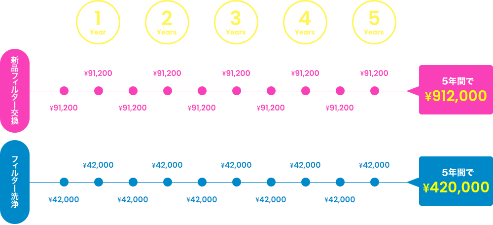 新品フィルター交換の場合:1本:¥7,600(当社で多いタイプ)=1式購入:¥91,200